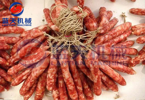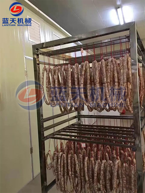 2、減速干燥階段。發(fā)色期和收縮定型期的控制,溫度控制在52℃~54℃,濕度控制在45%左右、時間為3到4個小時,臘腸逐漸從淺紅色轉(zhuǎn)為鮮紅色,腸衣開始收縮,這時一定要注意硬殼的出現(xiàn),可以進(jìn)行冷熱交替使用,效果更好。