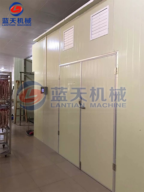 1、等速干燥階段。歷時5到6個小時,在物料裝入烘干房后兩小時內(nèi),溫度快速升到60℃~65℃,不用排濕。這一過程主要是起到一個發(fā)酵的過程,控制肉不變色變味。預(yù)熱時間后,調(diào)節(jié)溫度到45℃~50℃。