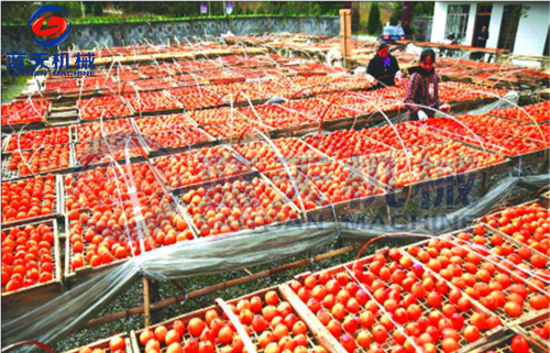 4:第一次烘烤   柿果進入柿餅烘干機后,迅速升溫至40——50°c,使柿果內(nèi)乙醇脫氫酶活性處于最高狀態(tài)。內(nèi)呼吸也加強,借以快速完成軟化,脫澀和部分脫水(25%左右),持續(xù)時間約12h,視柿果大小,成熟度靈活掌握。干燥柿餅時,防霉十分關(guān)鍵,稍有不慎,即會在幾個小時內(nèi)造成整個烤房中的柿果霉爛損失。因此,需要使烤房內(nèi)的相對濕度始中保持在70%以下,可有效防止柿果霉變。