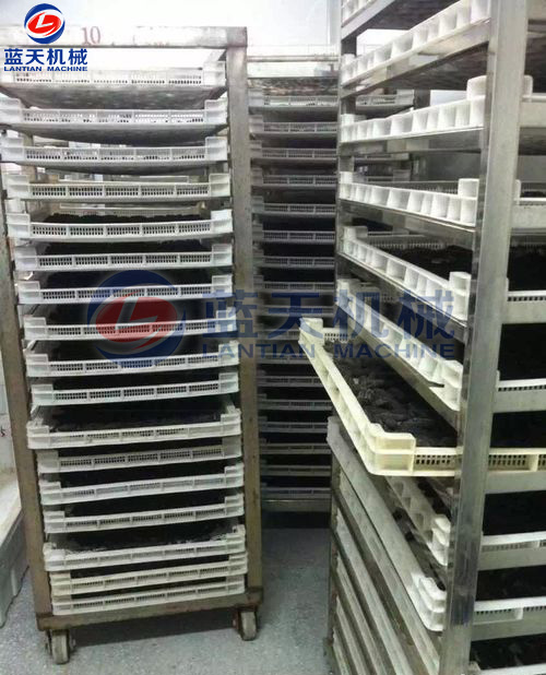 第四步:海參烘干:將煮好的海參擺放在物料盤上,將擺好海參的物料盤放置入空氣能熱泵海參烘干機(jī)內(nèi),通過(guò)智能控制系統(tǒng)設(shè)置烘干溫度、濕度和時(shí)間參數(shù),開(kāi)始干燥。