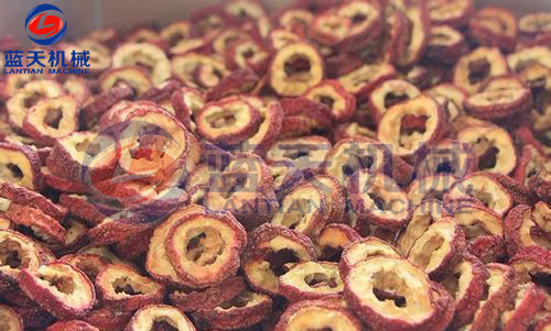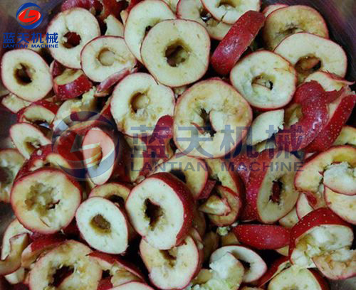 第二步:洗凈山楂果后,要盡快擦干其外表的水分,再進(jìn)行切片處理,需要去除或保留果核。現(xiàn)在也有專(zhuān)門(mén)的切片機(jī)器,效率很高,且切片的厚薄均勻,一般在3mm左右。