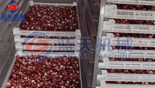 第三步:新鮮山楂片的含水率約為80%,干燥的目標(biāo)含水率約為13%,使用空氣能熱泵型烘干機(jī),將智能溫度設(shè)定為55°C左右的范圍,使山楂片所含的游離水大量蒸發(fā),熱風(fēng)循環(huán)系統(tǒng)不斷輸送新風(fēng),將風(fēng)量均勻的輸送至各層架,排風(fēng),促使蒸發(fā)的水份通過(guò)凝結(jié)水管路系統(tǒng)排出。