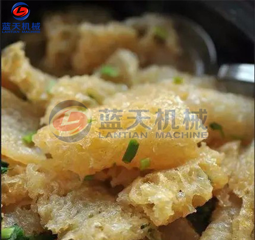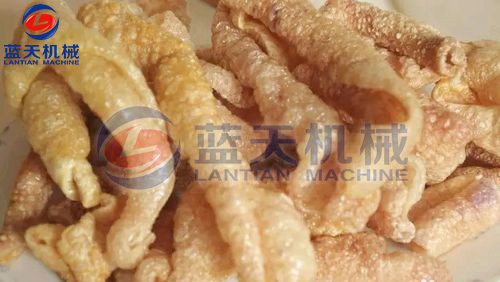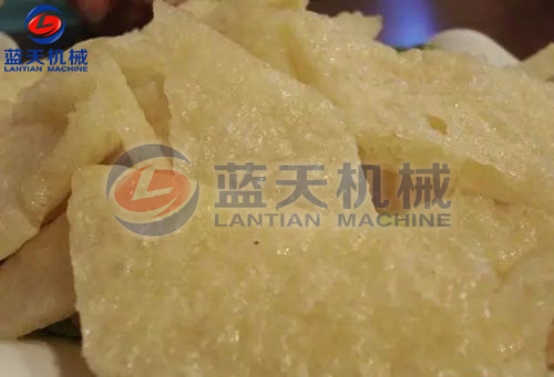 在油爆漲發(fā)前,豬皮需要在溫油中回軟,這是能否漲發(fā)的關鍵,油溫應該掌握在40-50度左右,溫度高了也會影響漲發(fā)的程度,是否回軟達標、視肉皮軟塌程度確定,這項操作標準在文字上無法準確清楚表述,只有在加工過程中熟能生巧,最終生產加工經驗是主要的?;剀浐蟮拇捅馄摫3只剀洜顟B(tài)不能回硬,將鍋中油溫升到80度后即可將肉皮放入油鍋中,邊翻動邊加溫,油溫達到120度時豬皮就可以漲發(fā)好了,在漲發(fā)時油溫應掌握好,不得過高,關鍵是保持不焦不老不黃的感官程度和完全漲發(fā)開的標準,完全漲發(fā)后的皮肚,從熱油鍋內撈出后應當控盡油脂并冷卻到常溫后方可包裝。不得未控盡油脂和降低溫度就進行包裝,否則既影響包裝又影響產品質量。