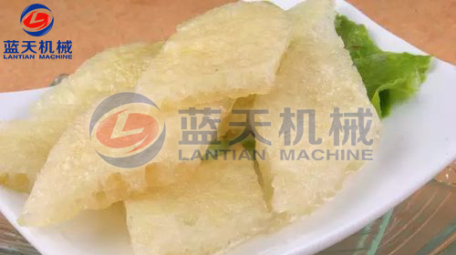可選用煺毛后的、無疫病、無疤痕的豬皮。先將剝下的豬皮放入溫水中浸泡30分鐘,然后用竹刷或塑料刷刷洗,用刀刮除表皮上的污物,修凈污物,去凈雜毛并采取連根拔除的方法,盡量不用利刀刮毛的便利方法,避免將毛根留在肉皮內而影響成品品質,將殘留的肉皮表面的脂肪用刀修理干凈,要求不得殘留一絲脂肪,以免影響油爆漲發(fā)的程度,然后將清洗干凈、已去除脂肪的豬皮進行分切整形(有些地區(qū)的傳統(tǒng)工藝需要蒸煮后在分切),分切快形大小在5-10平方厘米之間,不得超過10平方厘米,否則油爆漲發(fā)后包裝困難,小于5平方厘米的自然皮塊也可以加工,無需再切成小塊和整形,否則經包裝、運輸、銷售環(huán)節(jié)后容易造成碎塊,根據市場需求也可以將豬皮切絲、切丁等形狀,以滿足不同的客戶需求,將切好的皮塊放入物料網格盤,將物料網格盤像抽屜一樣插入物料車,將物料車推入烘干房,關閉封閉門,烘干就可以開始了。