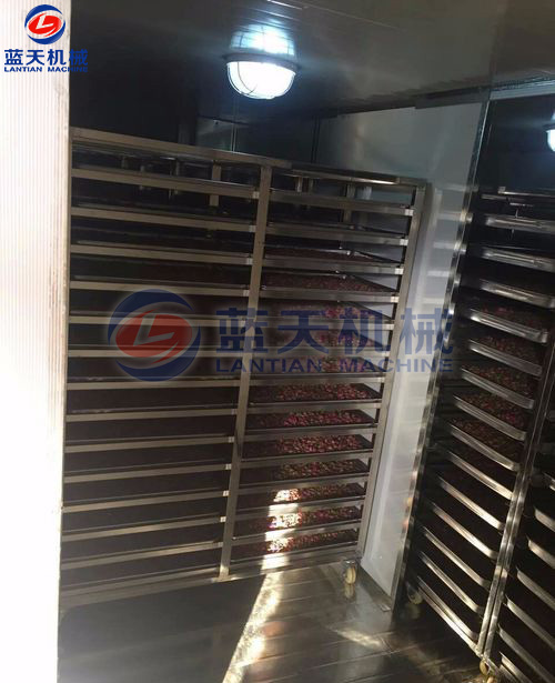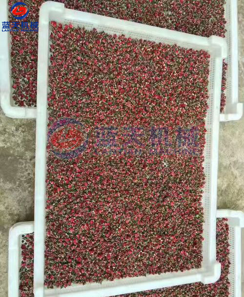 6P烘干除濕一體主機(jī)配置5.8米長(zhǎng)3米寬2.2米高10公分聚氨酯保溫烘干房,可以一次裝入鮮花1500斤,物料車進(jìn)入烘干房,設(shè)定好烘干程序,分成三段,溫度從48度到58度依次提升,除濕連續(xù)不停止,時(shí)間30小時(shí),完成后人工檢測(cè)干花蕾,只要色澤鮮艷,具有玫瑰特有的香氣,花蕾呈飽滿紡錘形,顏色為紫紅色或醬紫紅色,花托、花萼為黃綠色,用手捻花蕾呈粉片狀,花托70-80%的用手捻碎后呈粉絲狀時(shí),表示已干透,此時(shí)裝滿干花蕾的物料車就可以推出烘干房。