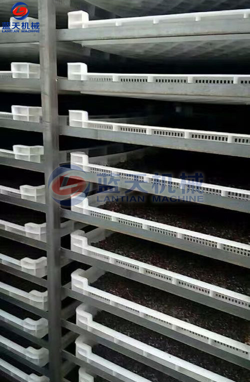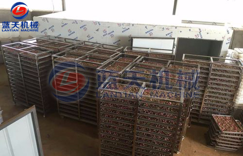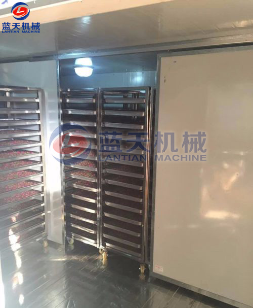 裝滿花蕾的物料車要輕輕推入烘干房,關(guān)閉烘干房室門(mén)升溫,嚴(yán)格控制室內(nèi)溫度、依次順序溫度慢慢提升,采用循環(huán)風(fēng)路,確?;ɡ俑蓾窬鶆颍珴甚r艷。