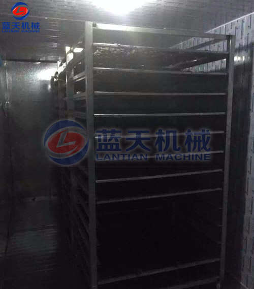 1)將木耳或云耳一層層均勻擺放至特氟龍材質(zhì)的托盤后,放入不銹鋼物料車,推入木耳烘干房,木耳烘干時(shí)的溫度應(yīng)從35℃開始,如果溫度過高,排濕跟不上,容易引起木耳變形。