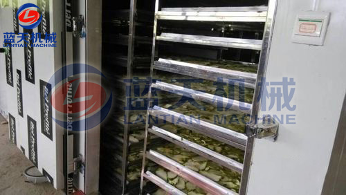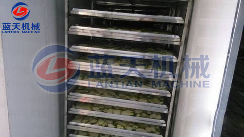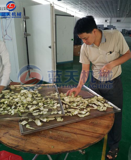 將切片好的佛手片放置于物料車托盤,注意堆放厚度不要超過3CM,這樣有助于烘房內(nèi)平流風(fēng)對整個(gè)物料的烘干效果保持一致性。