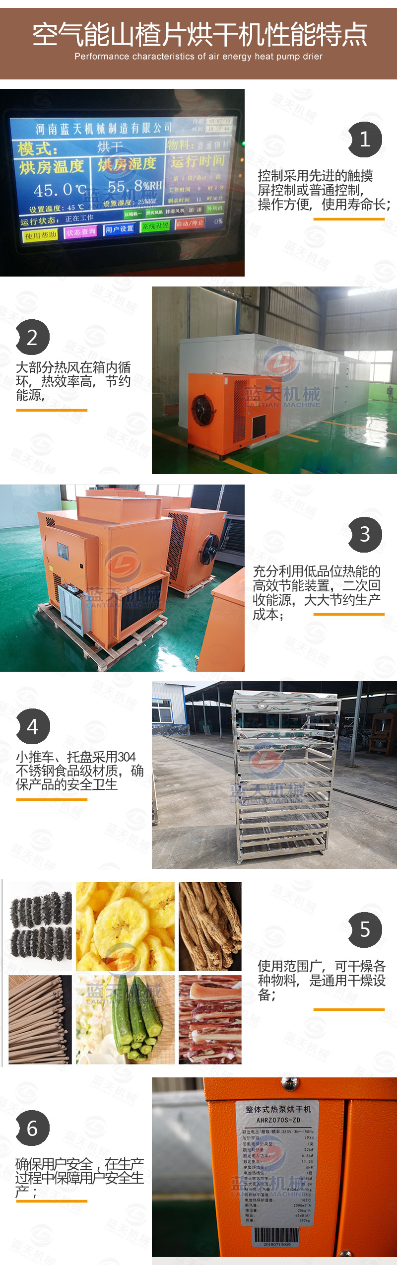 新鮮山楂片的含水率約為80%,烘干的目標(biāo)含水率約為13%,使用空氣能熱泵小型山楂片烘干機(jī),將智能溫度設(shè)定為55度左右的范圍,使山楂片所含的游離水大量蒸發(fā),熱風(fēng)循環(huán)系統(tǒng)不斷輸送新風(fēng),將風(fēng)量均勻的輸送到各層架,排風(fēng),促使蒸發(fā)的水份通過凝結(jié)水管路系統(tǒng)排出。