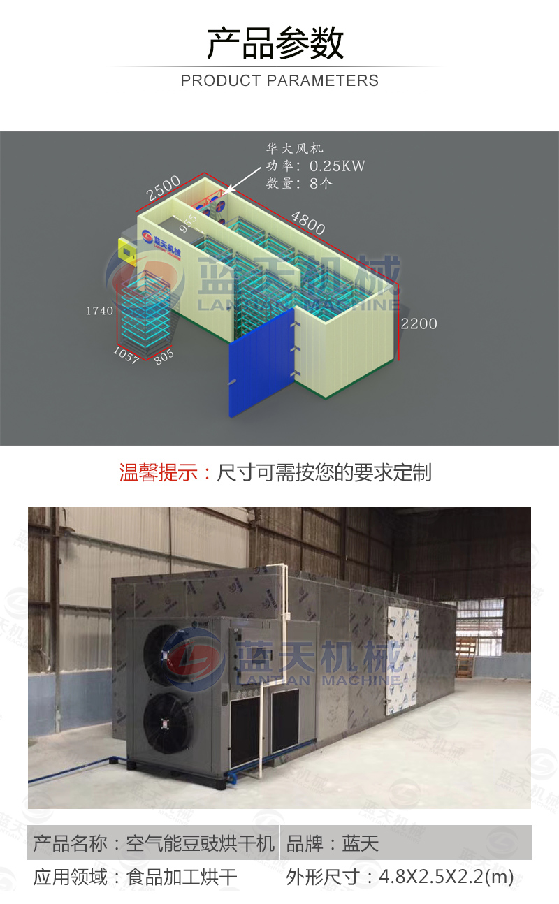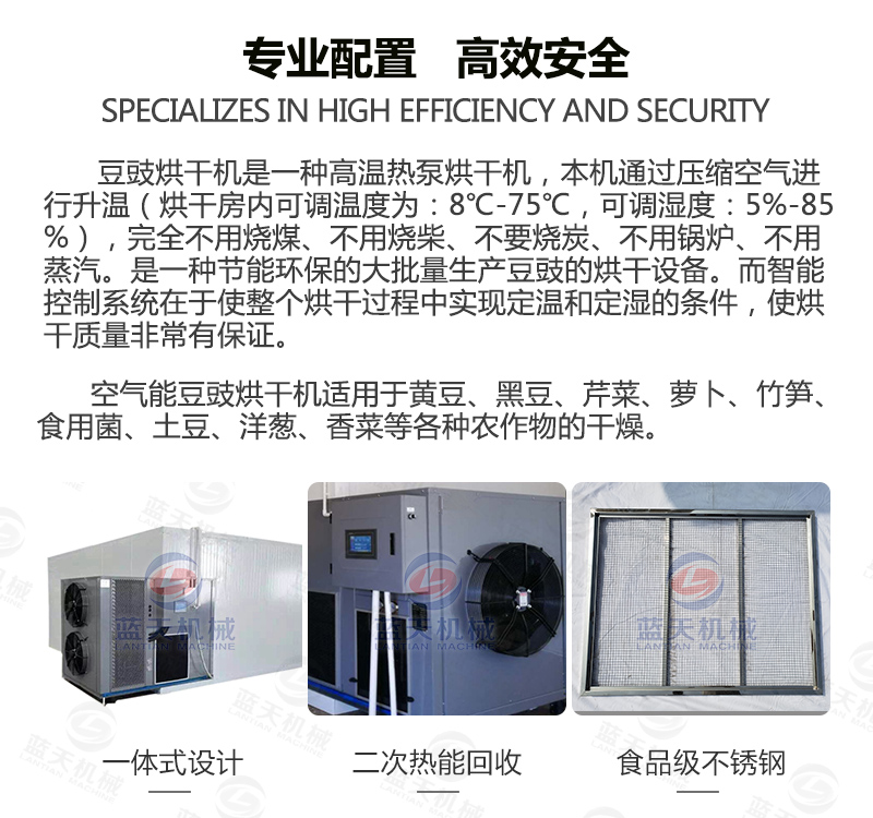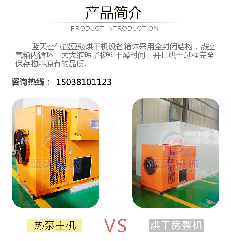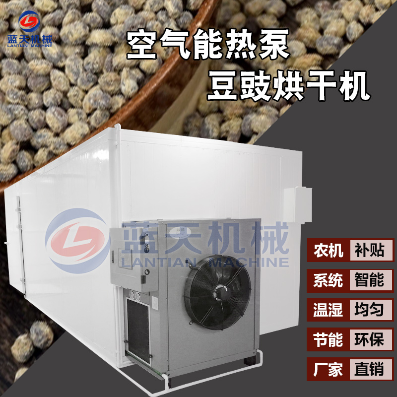 豆豉富含蛋白質(zhì)、各種氨基酸、乳酸、磷、鎂、鈣及多種維生素,色香味美,我國南北部都有加工食用。但若不注意加工藝,會致使品質(zhì)下降,甚至霉變,造成經(jīng)濟損失。傳統(tǒng)上使用太陽光曬制,但是生產(chǎn)效率低下,并且在曬制過程中極容易有污染,本文介紹使用一種基于空氣能熱泵技術的豆豉烘干設備,大大加快了豆豉的生產(chǎn)流程。