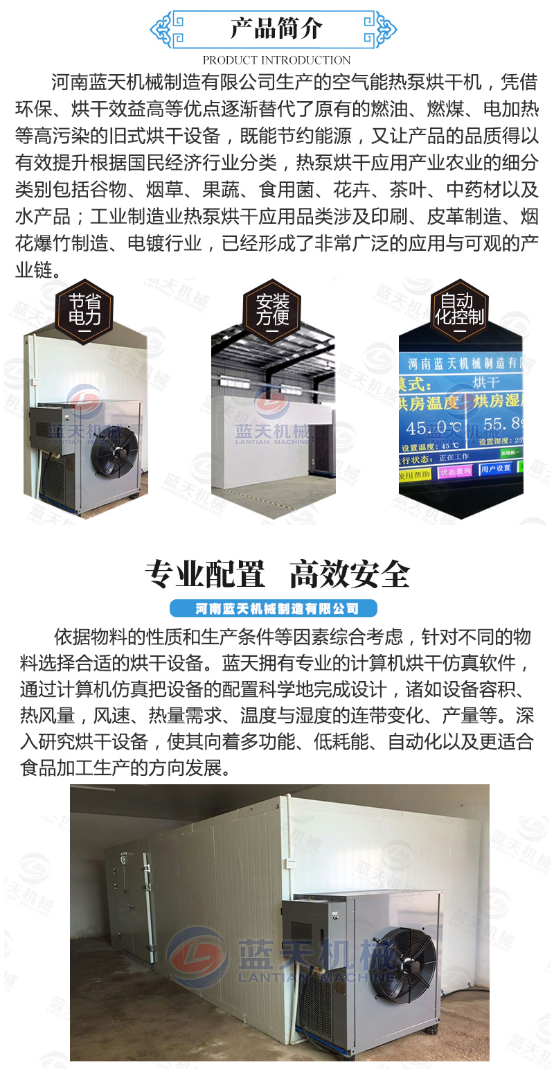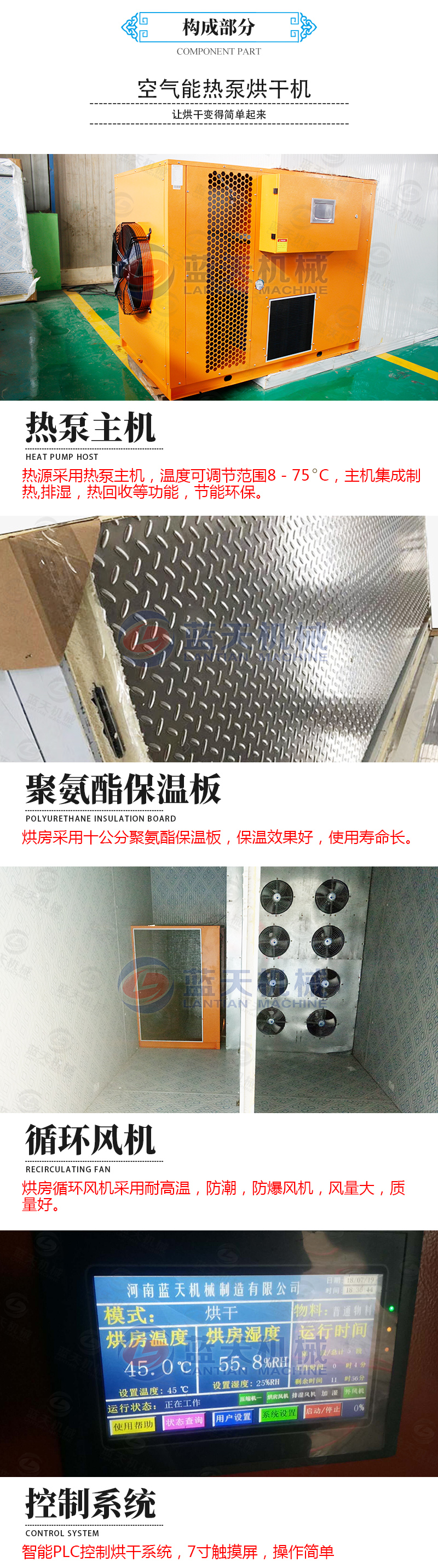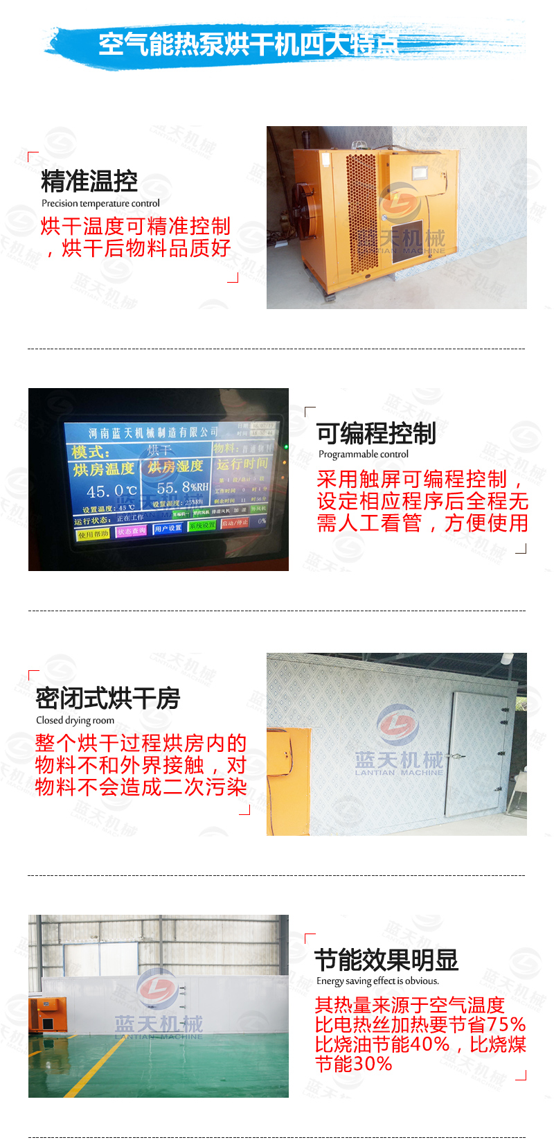 空氣能熱泵烘干設(shè)備有哪些功能?標配的功能有烘干、除濕、排濕、冷干、四效熱回收、觸摸屏控制、可編程(分10個時段)