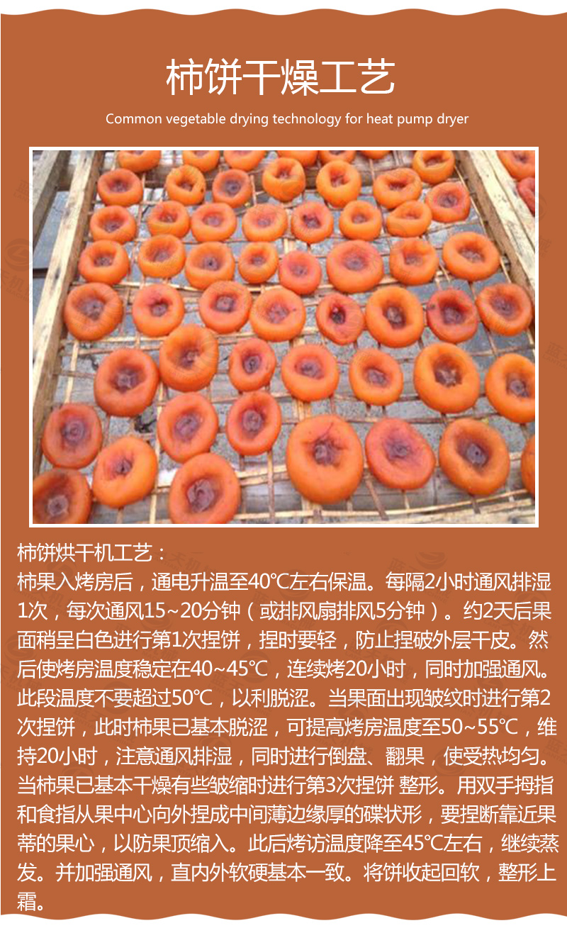 目前,國內(nèi)柿餅烘干加工工藝主要采取自然干制的傳統(tǒng)民間加工工藝。其主要流程為選果、去皮、日曬壓捏、脫色、捏曬整形、定型出霜然后包裝。由于自然干制的方法生產(chǎn)周期長,同時因長達(dá)數(shù)月的自然晾曬,微生物污染嚴(yán)重,因此產(chǎn)品的衛(wèi)生質(zhì)量差,自然干制還有占地多、用人多、用時長等缺點,我們對柿餅用熱泵烘干的進(jìn)行研究,有了柿餅烘干機(jī)的產(chǎn)生,并取得突破性的成果。